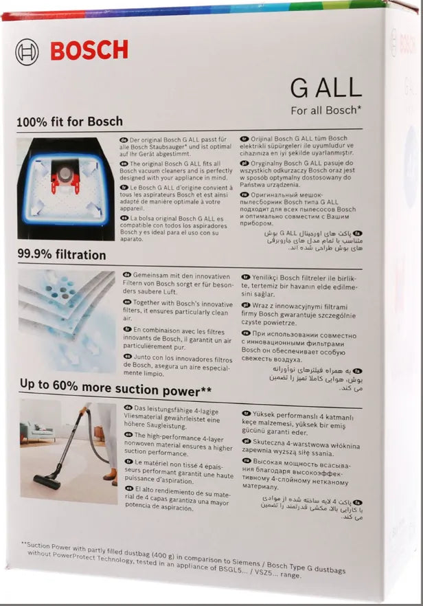 Sacchetti aspirapolvere Bosch Tipo G con filtro micro-igienico. Confezione da 4 pezzi.