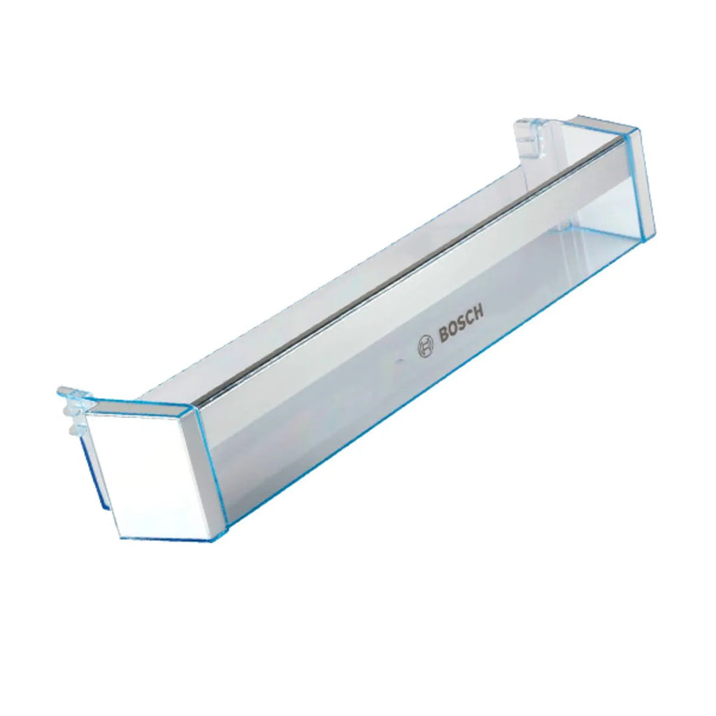 Vassoio porta bottiglie per frigorifero Bosch. Pezzo di ricambio originale per elettrodomestico da cucina. Lo scaffale si posiziona nella parte inferiore della porta del frigorifero.