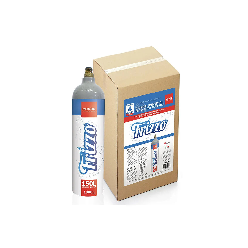 Confezione da 4 bombole di CO2 da 1 kg, nuove e universali, compatibili con distributori d'acqua dei marchi FRIZZO, MONDO. Queste bombole di anidride carbonica E290 di qualità alimentare sono ideali per gasatori domestici, garantendo acqua frizzante fresca e gustosa in ogni momento. Il loro design adattabile consente un'installazione e una sostituzione facili in un'ampia gamma di apparecchi. Goda della comodità e della qualità con questi ricambi essenziali per la sua casa.