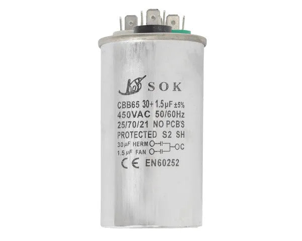 Questo condensatore di lavoro da 30µf + 1,5µf e 450V è un componente essenziale per il corretto funzionamento di un'ampia gamma di impianti di climatizzazione. Progettato per offrire una prestazione affidabile e duratura, garantisce una fonte di energia stabile e costante, ottimizzando l'efficienza dei motori della ventola e del compressore.