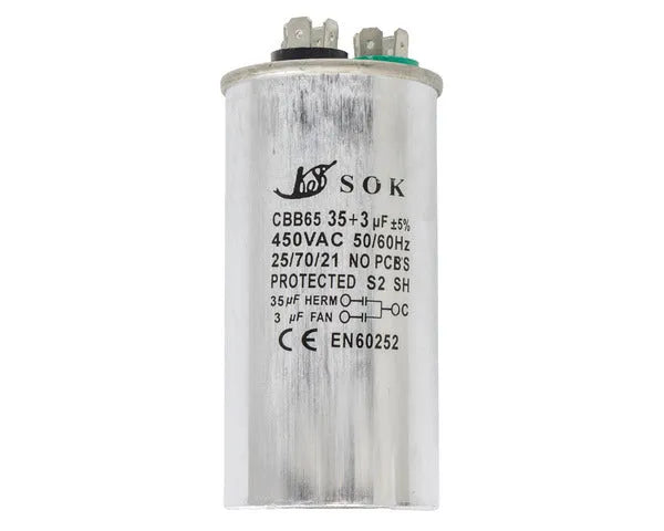 Capacità di 35µf e 3µf e tensione di lavoro di 450v. Realizzato con materiali metallici di elevata resistenza e durata. Aiuta a migliorare l’efficienza del sistema fornendo una fonte di energia stabile e costante per il funzionamento dei componenti del climatizzatore, inclusi i motori della ventola e del compressore.
