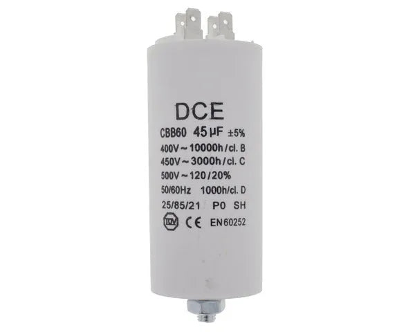 Questo condensatore di lavoro permanente da 45,0 microfarad 450V è un componente essenziale per il corretto funzionamento di vari elettrodomestici. Progettato per l'avviamento dei motori, garantisce una prestazione ottimale e una maggiore durata dei vostri apparecchi. Ideale per riparazioni e manutenzione di lavatrici, asciugatrici e lavastoviglie.