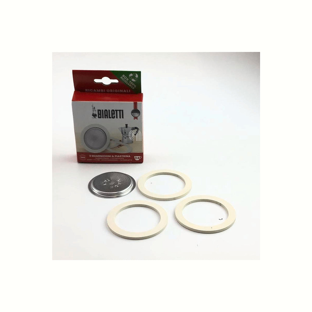 Questo kit include 3 guarnizioni e una piastra originale per caffettiere moka Bialetti da 3 a 4 tazze, progettato per mantenere il funzionamento ottimale e sicuro della tua caffettiera tradizionale in alluminio.