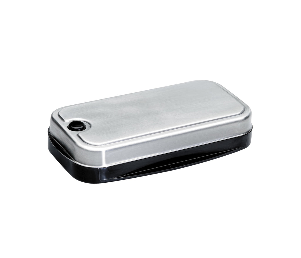Per aprire il coperchio, premere il pulsante con il pollice e tirare con l'indice la linguetta in acciaio inossidabile.