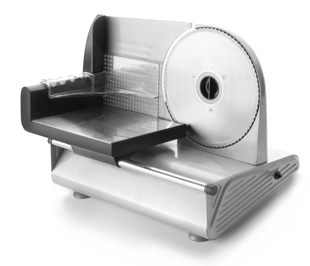 Affettatrice elettrica metallica con finiture in acciaio inox.