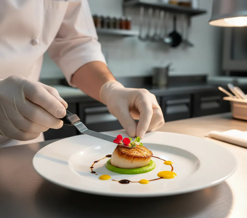 È particolarmente utile per lavori di precisione che richiedono un controllo millimetrico: posizionare microgreens senza schiacciarli, applicare punti esatti di salsa, decorare dessert con fiori commestibili, manipolare caviale o uova di pesce, aggiungere lamelle di tartufo, creare disegni con oro commestibile, decorare canapé e qualsiasi finitura finale che faccia la differenza nella presentazione. È lo strumento che trasforma un piatto ben cucinato in un'opera d'arte culinaria.