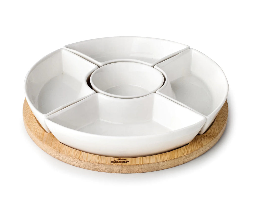 Vassoio in bambù con 5 ciotole in porcellana per servire piccole porzioni.