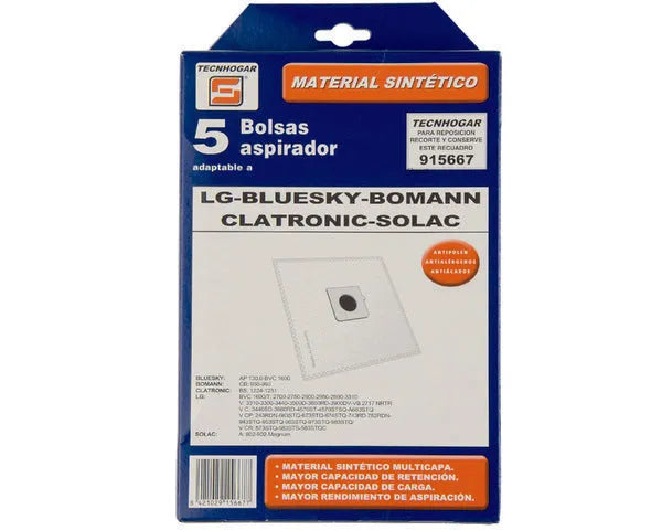 Sacchetto aspirapolvere sintetico multimarca 5 pz. C.O. 915667 BLUESKY, BOMANN, CLATRONIC, LG, SOLAC.