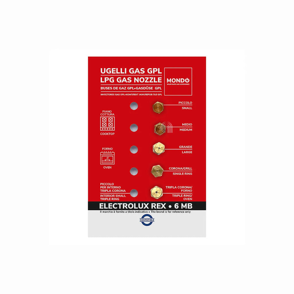 Set di 5 iniettori di gas GPL (gas butano/propano) per piani cottura delle marche ELECTROLUX, ZANUSSI, UNIVERSALE, MONDO. Questo set adattabile è ideale per la conversione della vostra cucina a gas liquefatto di petrolio, garantendo un funzionamento sicuro ed efficiente. Compatibile con un'ampia gamma di modelli di piani cottura.